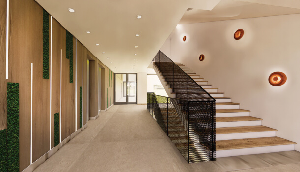 Az épület egyedi belső átriuma a földszinttől a legfelső emeletig biztosítja, hogy az oldalsó üvegfalon keresztül természetes fény járja be az épület közös területeit, így a lift előtereket és a recepciót is. Ide tényleg öröm lesz hazajönni.